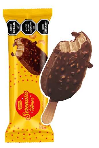 Crema helada sabor castañas de cajú con cobertura simil chocolate y trozos de castañas de cajú